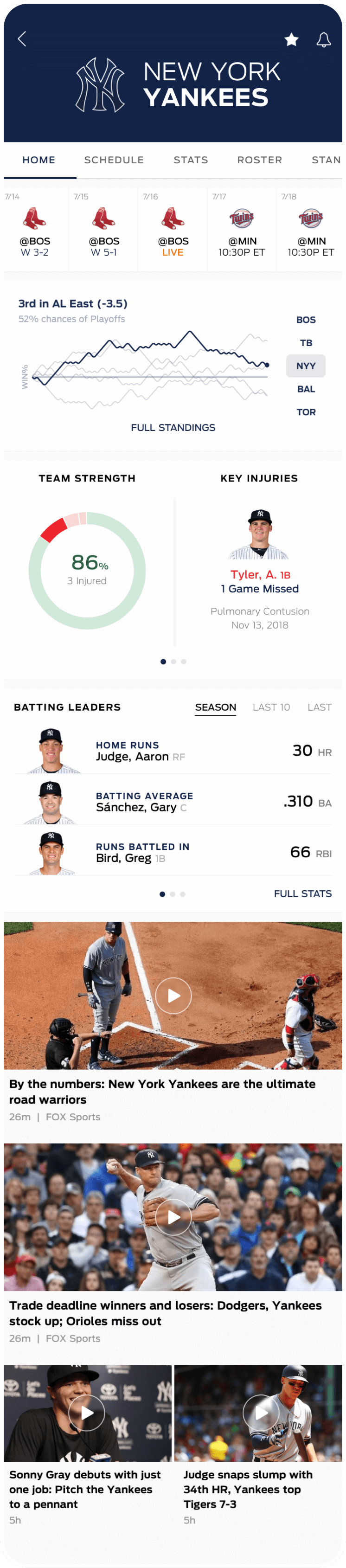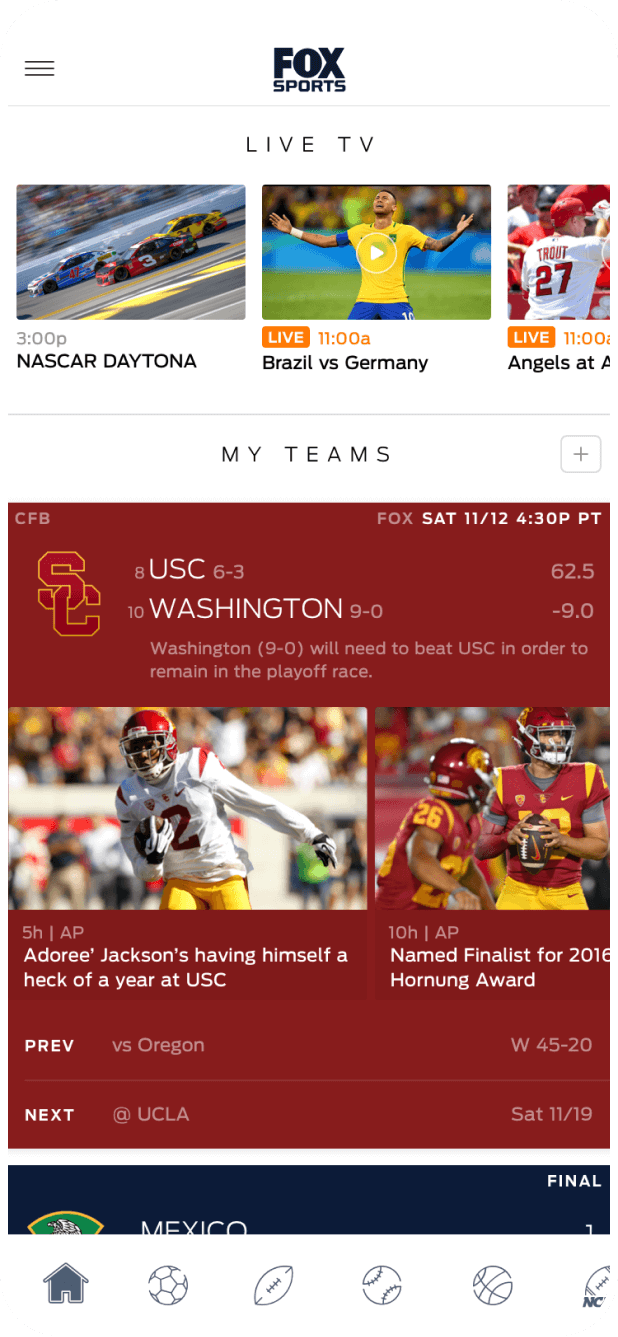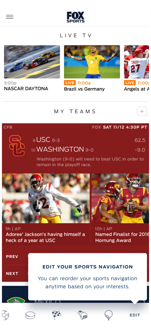 As a sports brand in a competitive market, FOX Sports wanted to offer a user experience that really resonated with its users. To do that, we spoke to users and discovered their favorite team is what they’re truly passionate about. So we focused on the fan’s teams and flattened the UX by bringing key information, like live game headlines and stats, directly onto the scoreboard. We also made it easier to get around the app by simplifying the navigation. Plus, we added best-in-class notifications to provide value beyond just browsing the app.