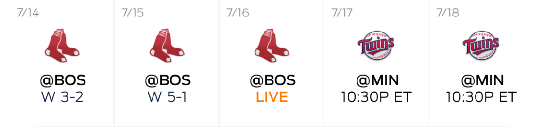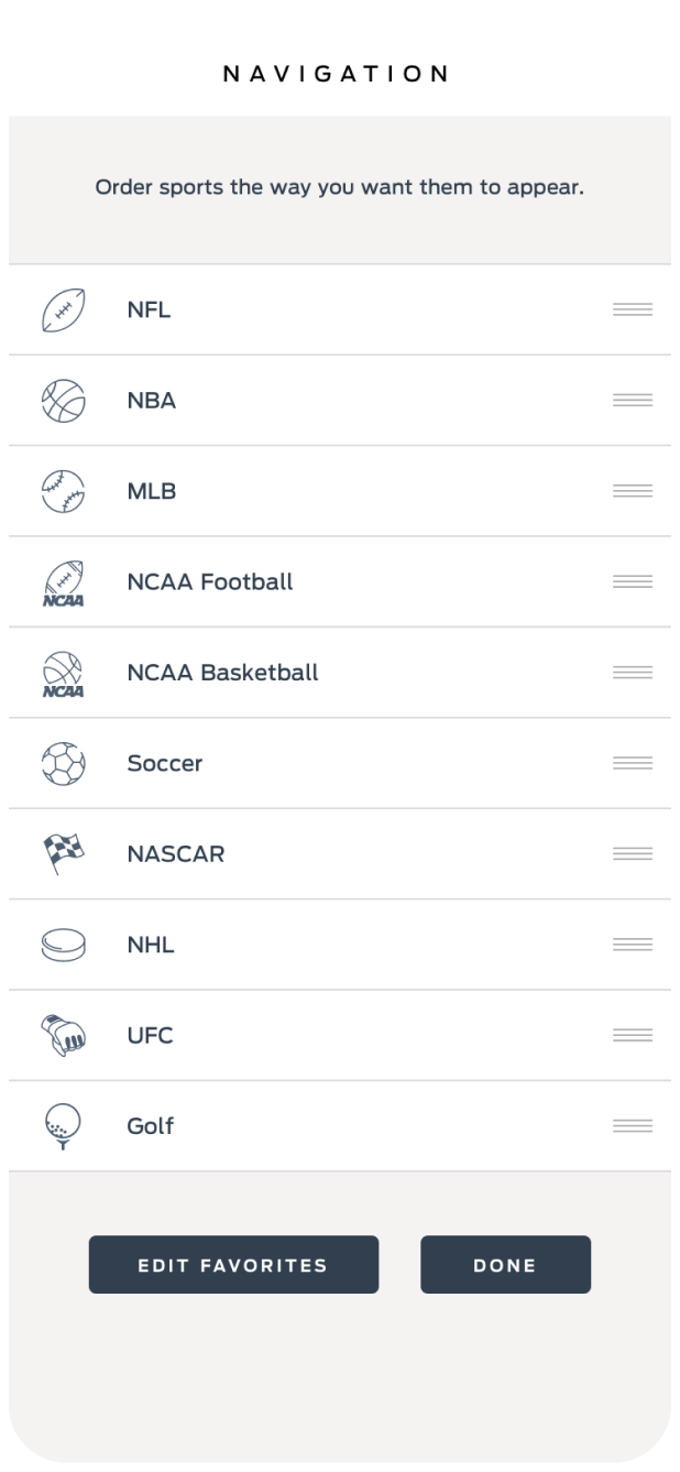 We improved the user experience by offering customizations tailored to each person’s unique interests. We employed a ‘hero’ design treatment for the user’s favorite teams to create a deeper emotional connection. We also provided more detailed information on the scoreboard for games featuring the user’s favorite teams, and included attractive and effective prompts for personalization. Furthermore, we gave priority to the user’s favorites on all screens and enabled them to easily select and reorder the main navigation items.
